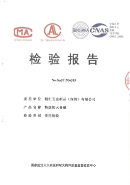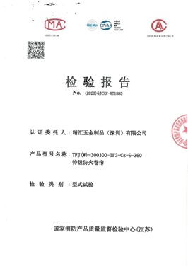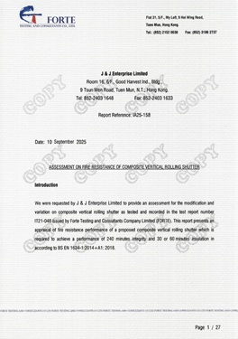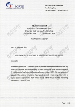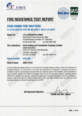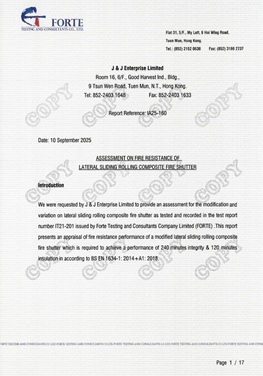 本公司已取得由認可測試中心發出的 BS EN 1634 防火隔熱捲閘合格證書,合資格生產防火隔熱的直閘、橫閘及電梯閘,防火隔熱效力可達 FRR -/240/150。